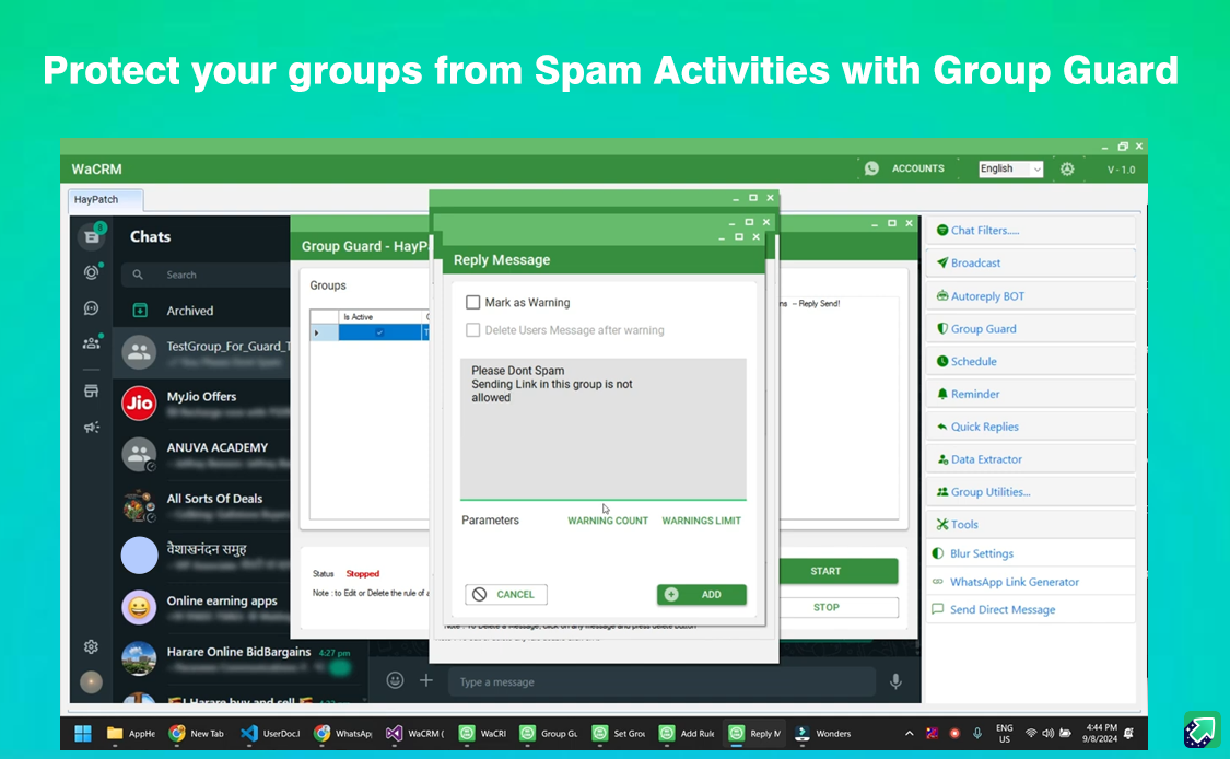 Protect your Multiple Groups from spam activities by group members and you can set protect multiple groups with all of your WhatsApp accounts