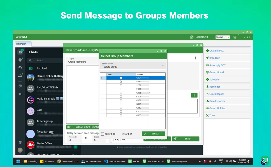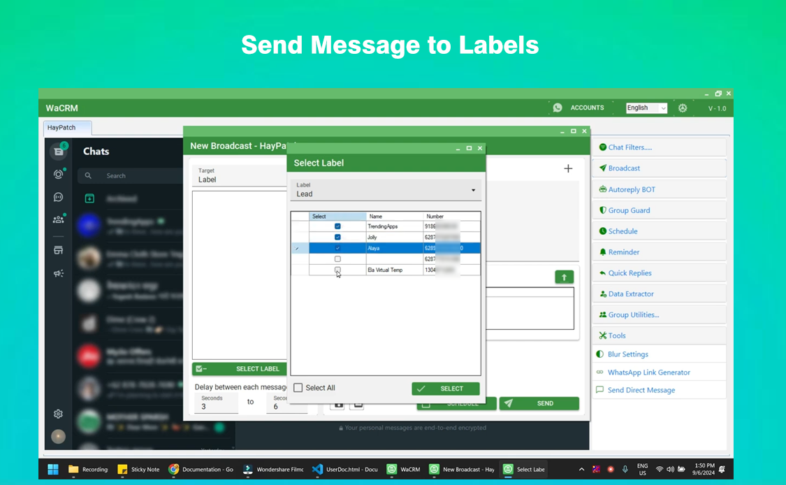 Send WhatsApp Messages to Contact ,Numbers, Labels, Unsaved Numbers and Groups with message and any type of attachments